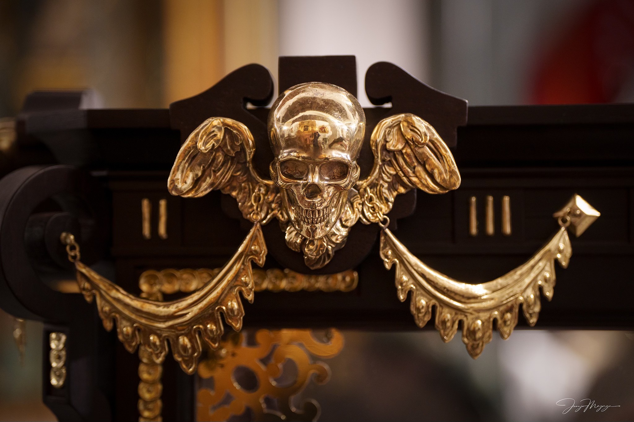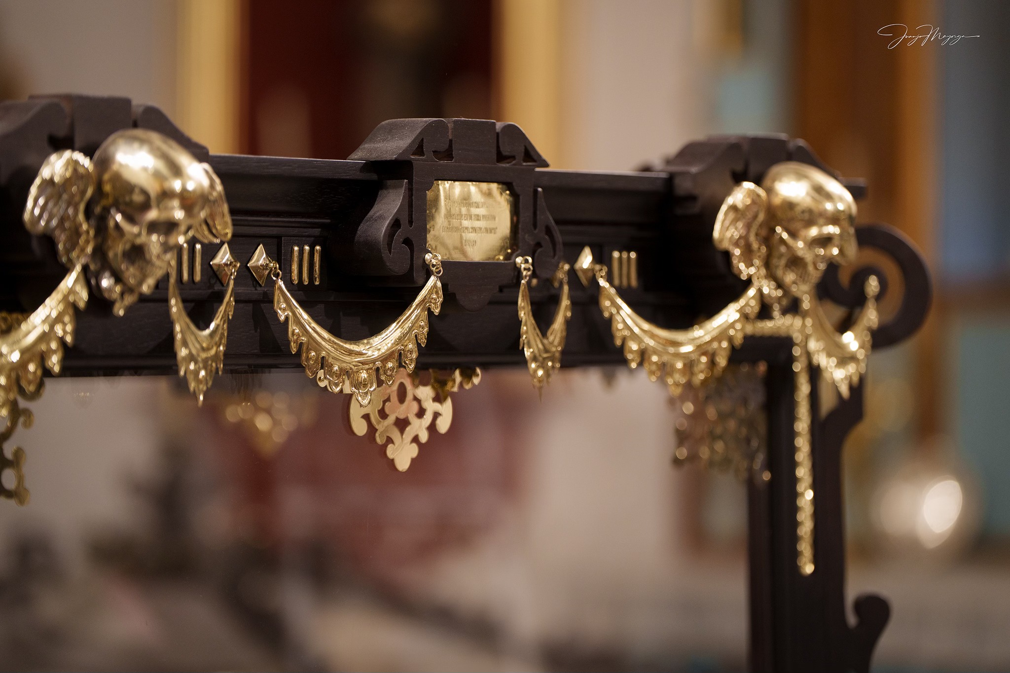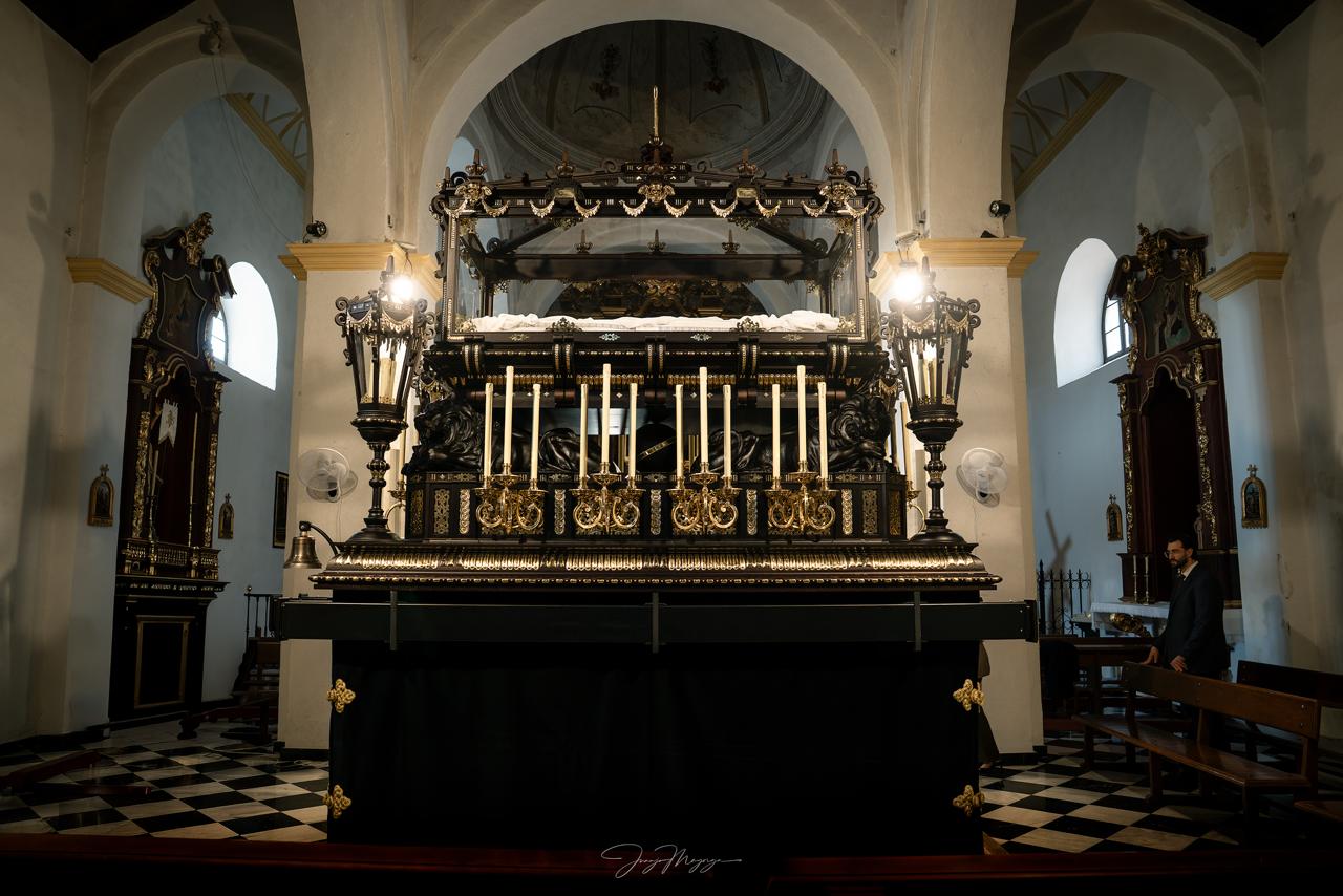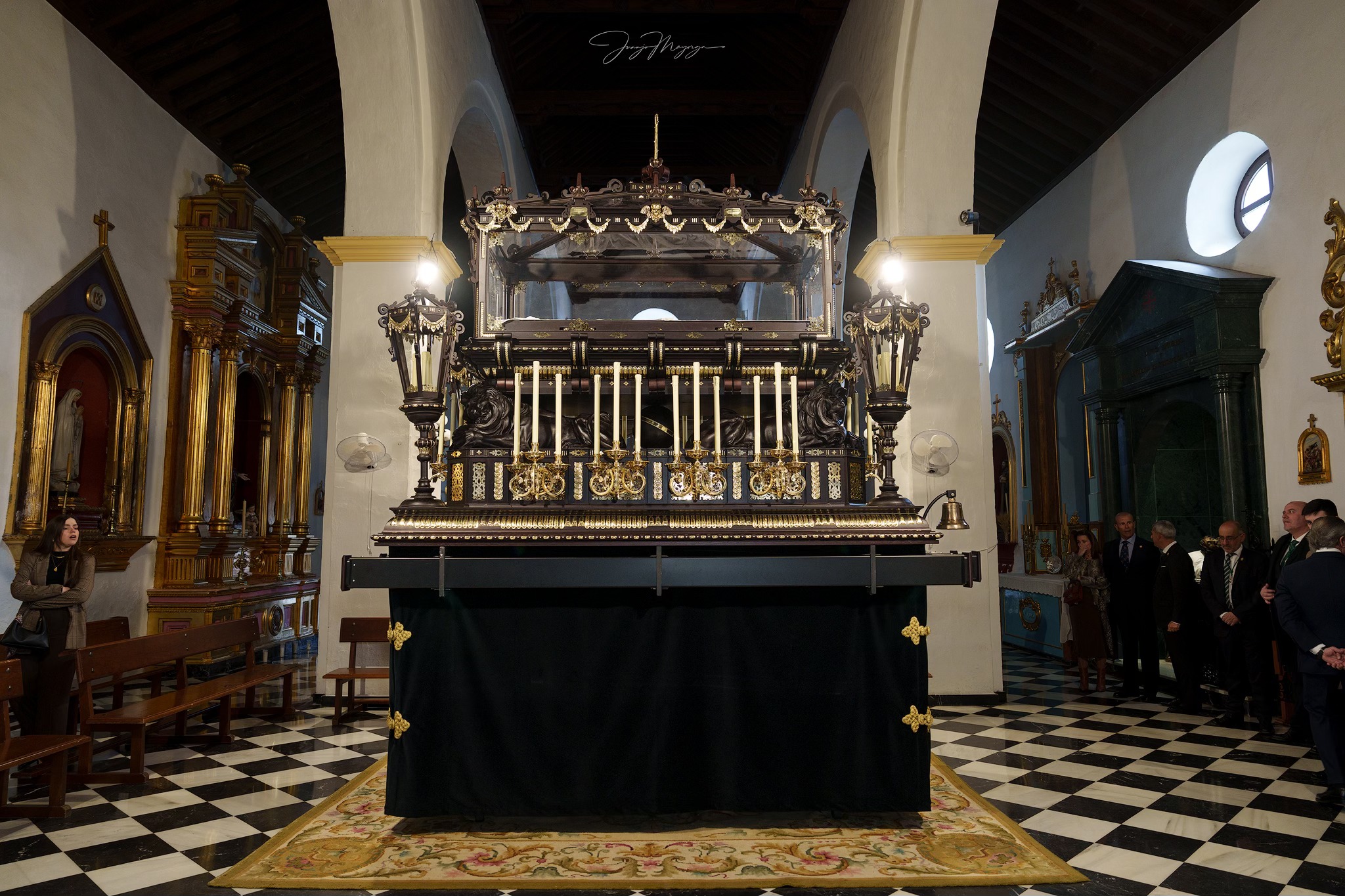 -La urna, otro de los elementos que felizmente recuperamos, tiene también una gran riqueza simbólica. Se convierte en una primera Custodia, que contiene el Cuerpo y la Sangre, Sacrificio Eucarístico que nos trajo la redención. Las calaveras aladas son una referencia directa a la muerte, que debió experimentar el mismo Dios por nosotros. Se ve rematada por la Verdadera Cruz, de la que pendió el más preciado de los frutos: el Santísimo Cristo.