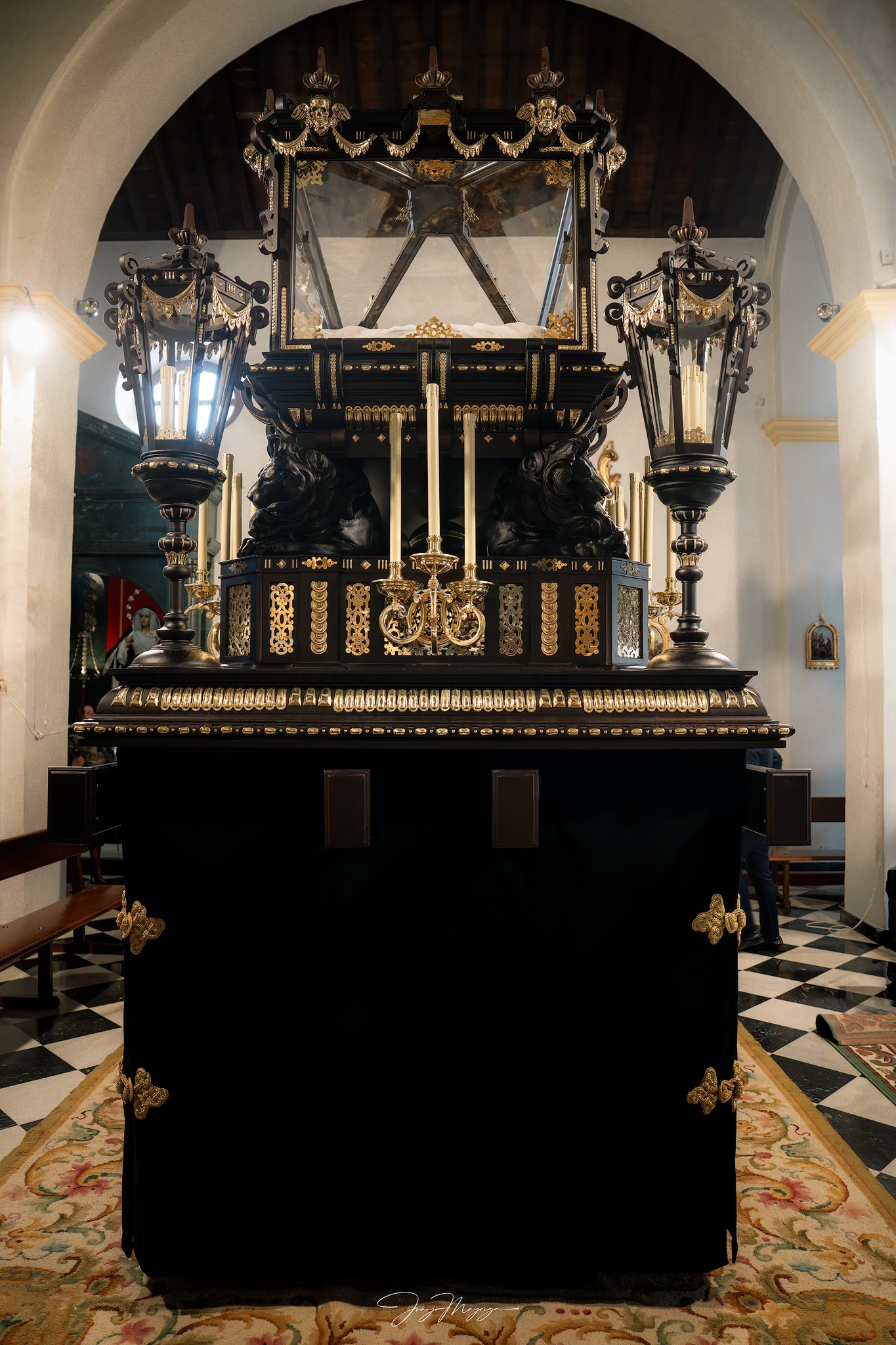 -Un conjunto que participa, además, del lenguaje fúnebre tradicional, creando una estampa única, que se completa con la presencia de las cuatro personas que portan los lazos. El maltrecho Cuerpo de Cristo (uno de los tesoros devocionales y patrimoniales de nuestra Hermandad), con los distintos tonos de la muerte, de la sangre, entra en el juego de los contrastes, con los matices de la madera, del bronce, del cristal y de las propias variaciones de la luz, ya sea de la que alumbra al conjunto, ya sea la natural que corresponda en la tarde del Viernes Santo.